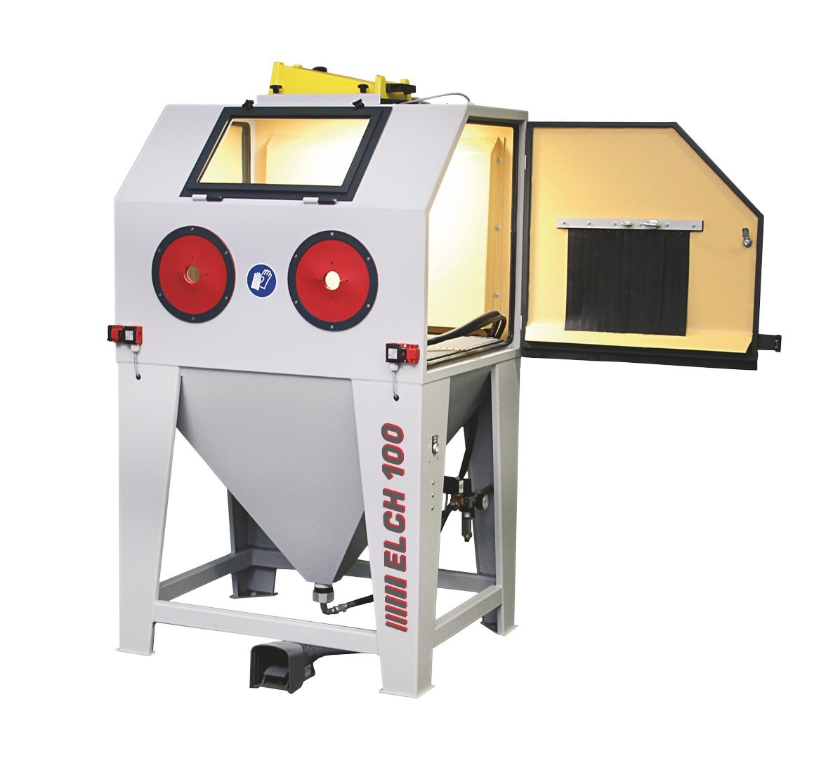 Kabinu za pjeskarenje tip Elch 100 preporučujemo za pjeskarenje srednje velikih dijelova. Punjenje se vrši kroz dvoja bočna vrata s desne i lijeve strane koja su opremljena otvorima za uvlačenje i provlačenje. Dimenzije prostora za pjeskarenje (Š x D x V): 1.000 x 700 x 750 mm.